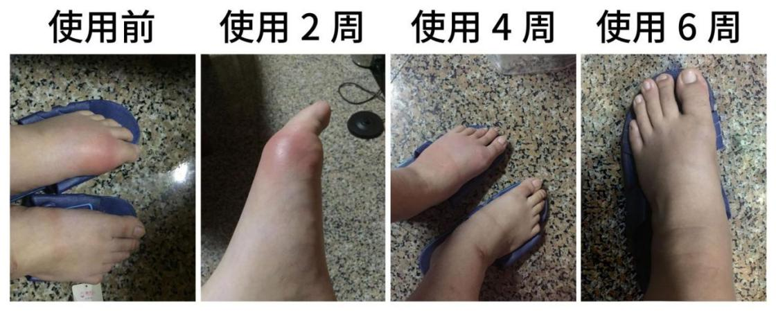 使用前痛风石直径2cm,使用6周后痛风石完全消除。