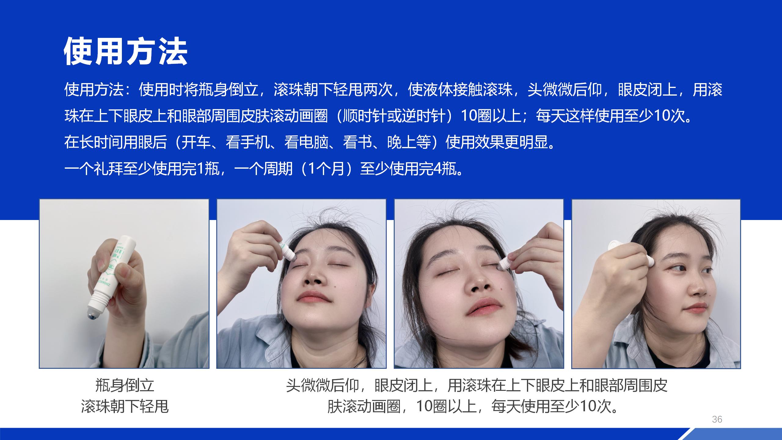 使用时,产品内含的液体不直接进入眼球仅需闭眼后,使用滚珠在眼皮及眼部周围肌肤上按摩滚动、画圈十圈以上,对眼睛没有任何刺激和伤害。有效成分即可快速透皮吸收,经过人体皮肤选择性的渗透到达眼睛里面,效果立竿见影,体验感非常强,可以长期安全使用,解决各种眼疾问题。