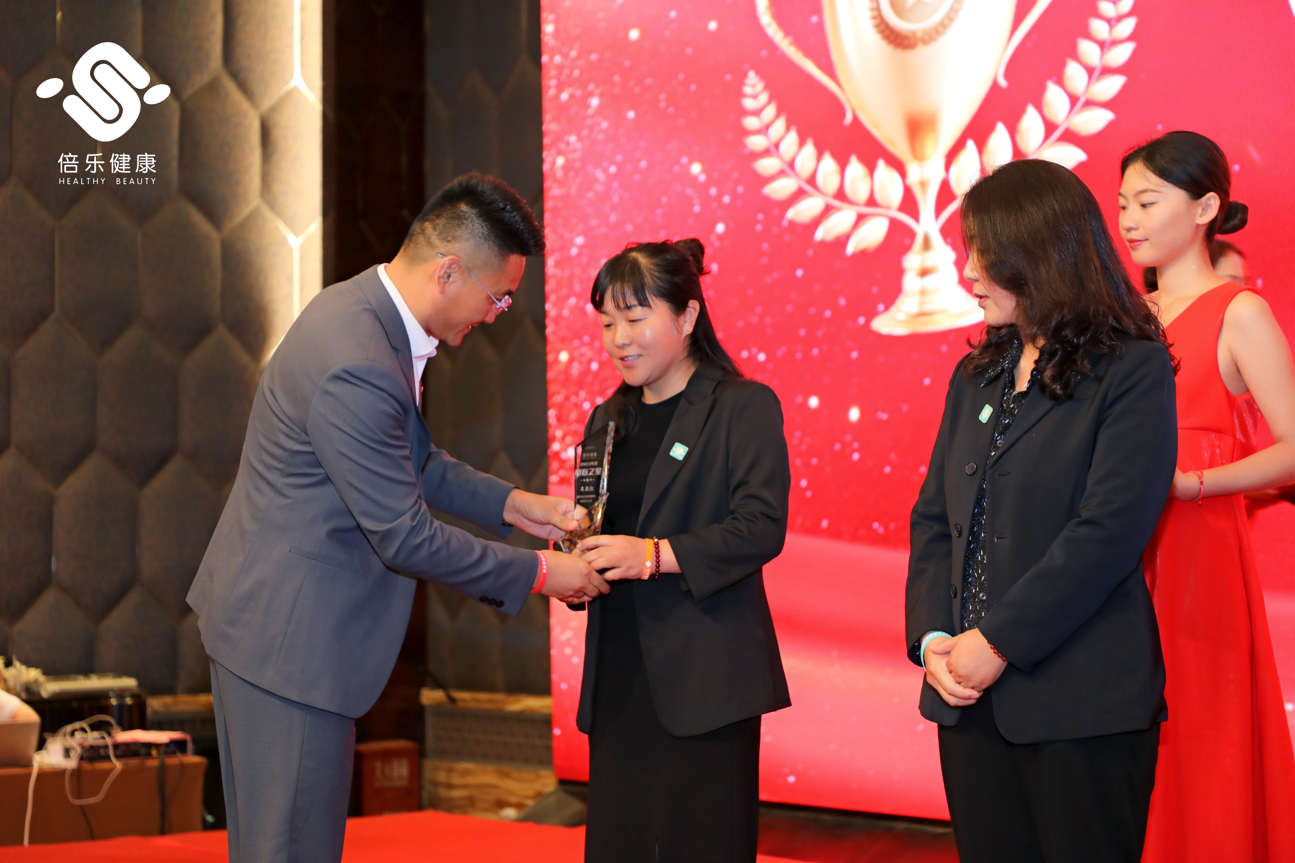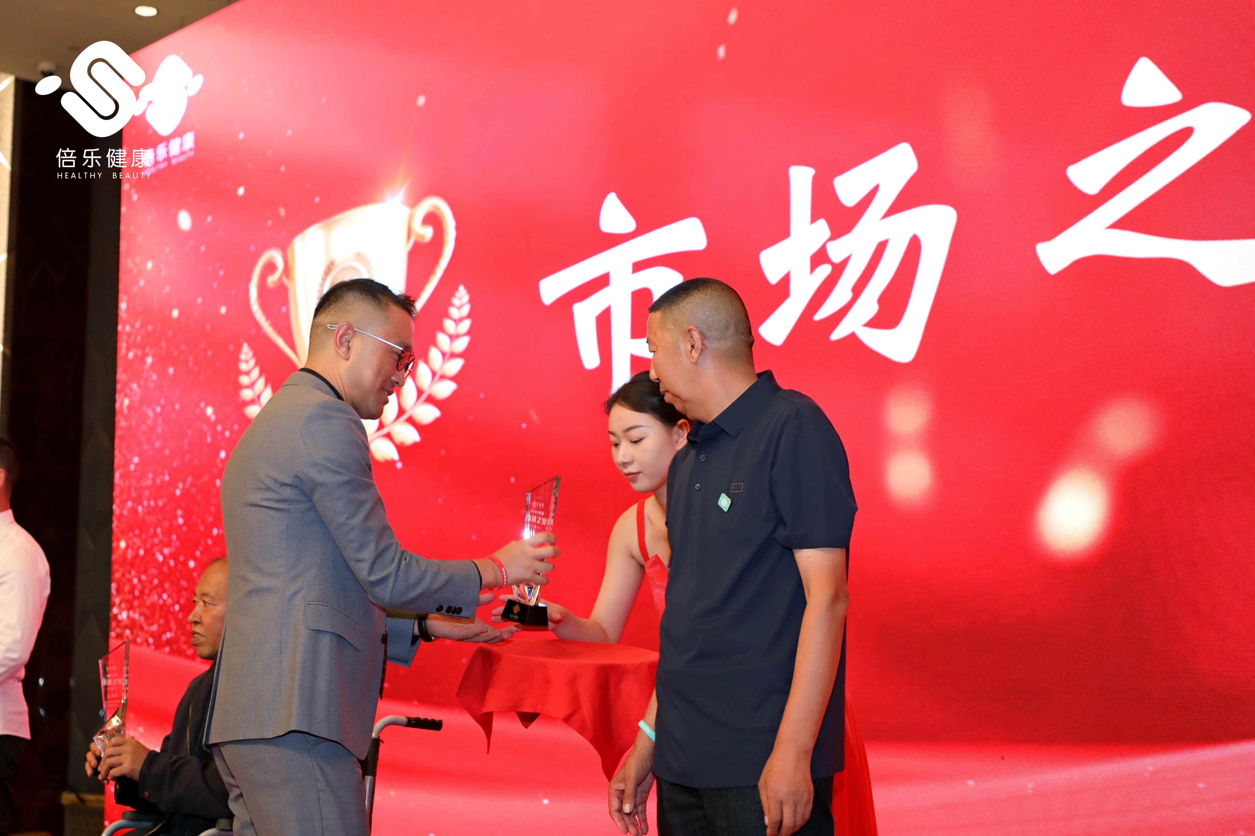 龚总详细地为大家解释了“小关节 大蓝海”轻创业项目的具体方案及项目前景,随后活动进入颁奖环节,迎着激昂的音乐,获奖代理商们陆续上台,张伯科博士、李玉朝董事长和胡峰总经理作为本场活动的颁奖嘉宾,为20229-20238月期间的年度优秀合作伙伴(即市场之星、商城之星、服务之星)颁发奖杯并现场合影留念,台上台下变成了欢乐的海洋。