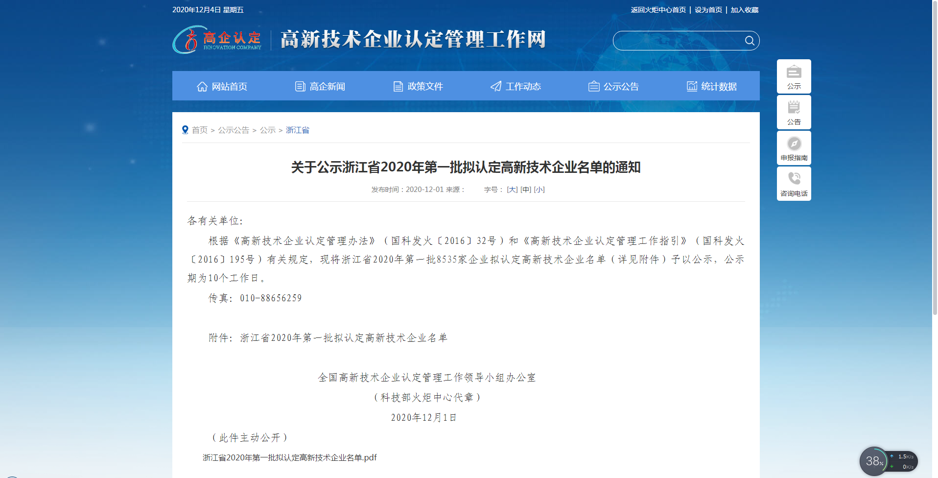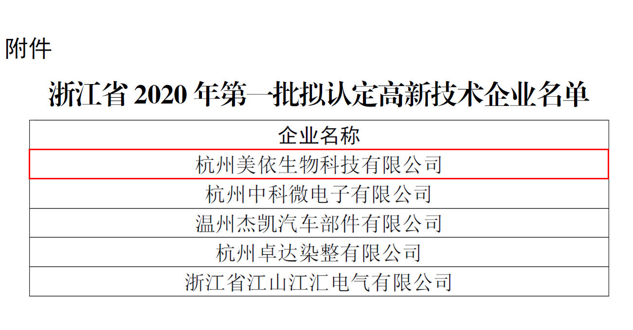 近日,根据浙江省高新技术企业认定工作领导小组下发的根据《高新技术企业认定管理办法》(国科发火〔2016〕32号)和《高新技术企业认定管理工作指引》(国科发火〔2016〕195号)有关规定所示,杭州美依生物科技有限公司,被认定为国家2020年第一批高新技术企业。