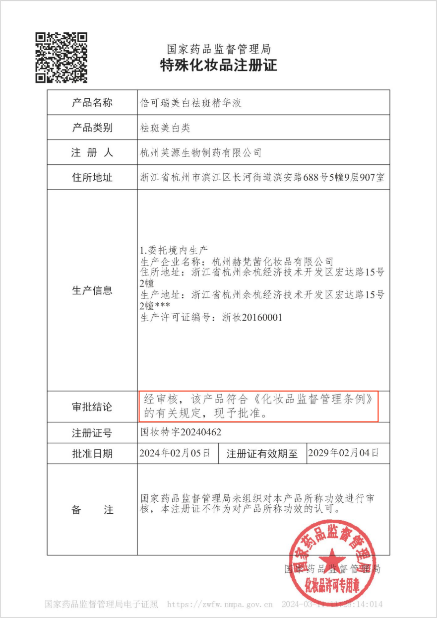 根据2021年我国特殊化妆品新规,美妆类特殊化妆品须通过监管部门的多项检测、审核要求,进行人体亲测,且产品达到安全和功效要求后方可获批,从申请到拿证,时间长达18个月。持新证上岗的倍可瑞产品,标志功效、安全达到了国人体亲测要求,消费者可以毫无顾虑地购买使用。