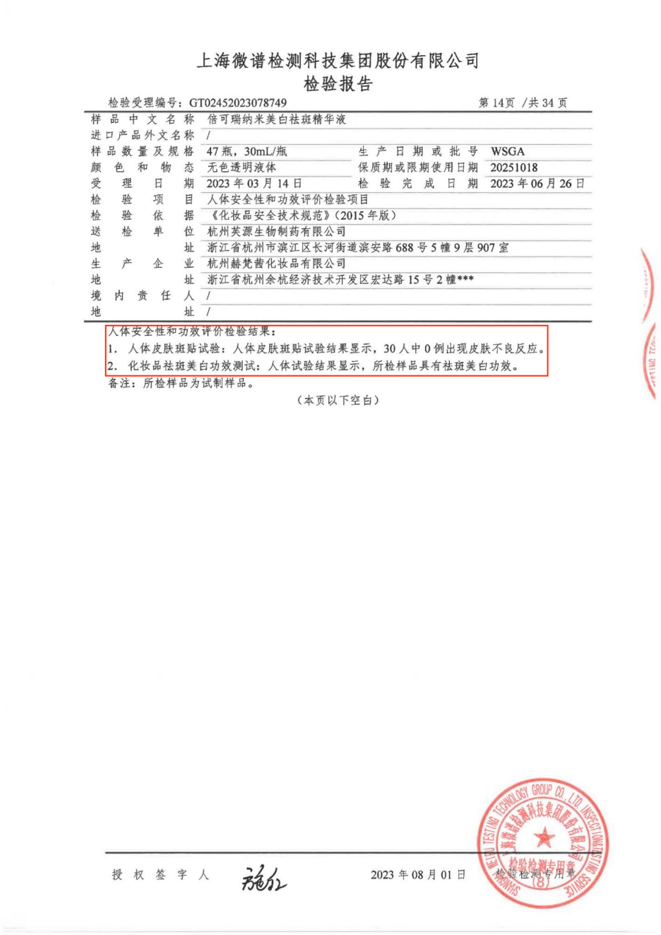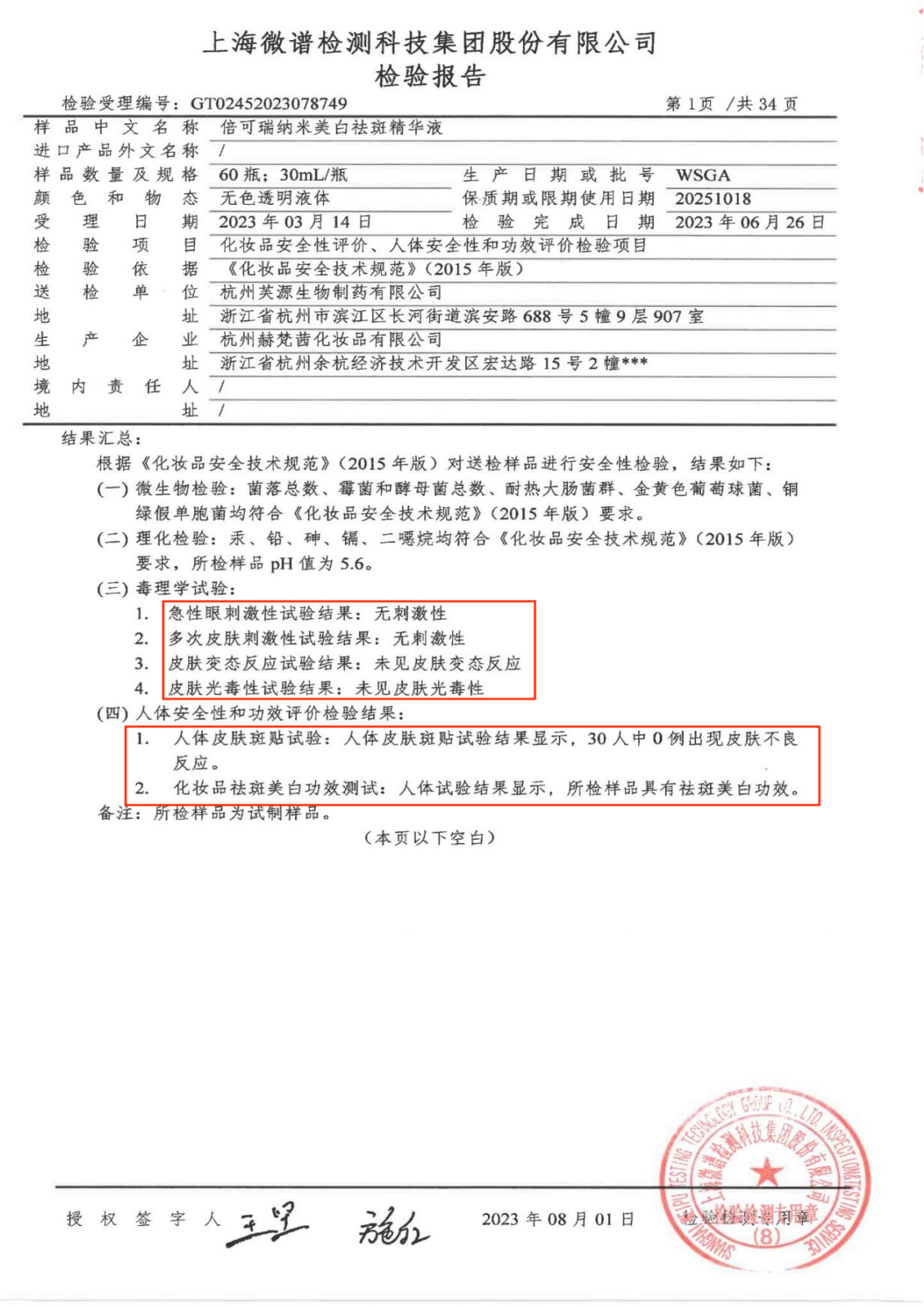 美白祛斑精华液安全功效检测报告