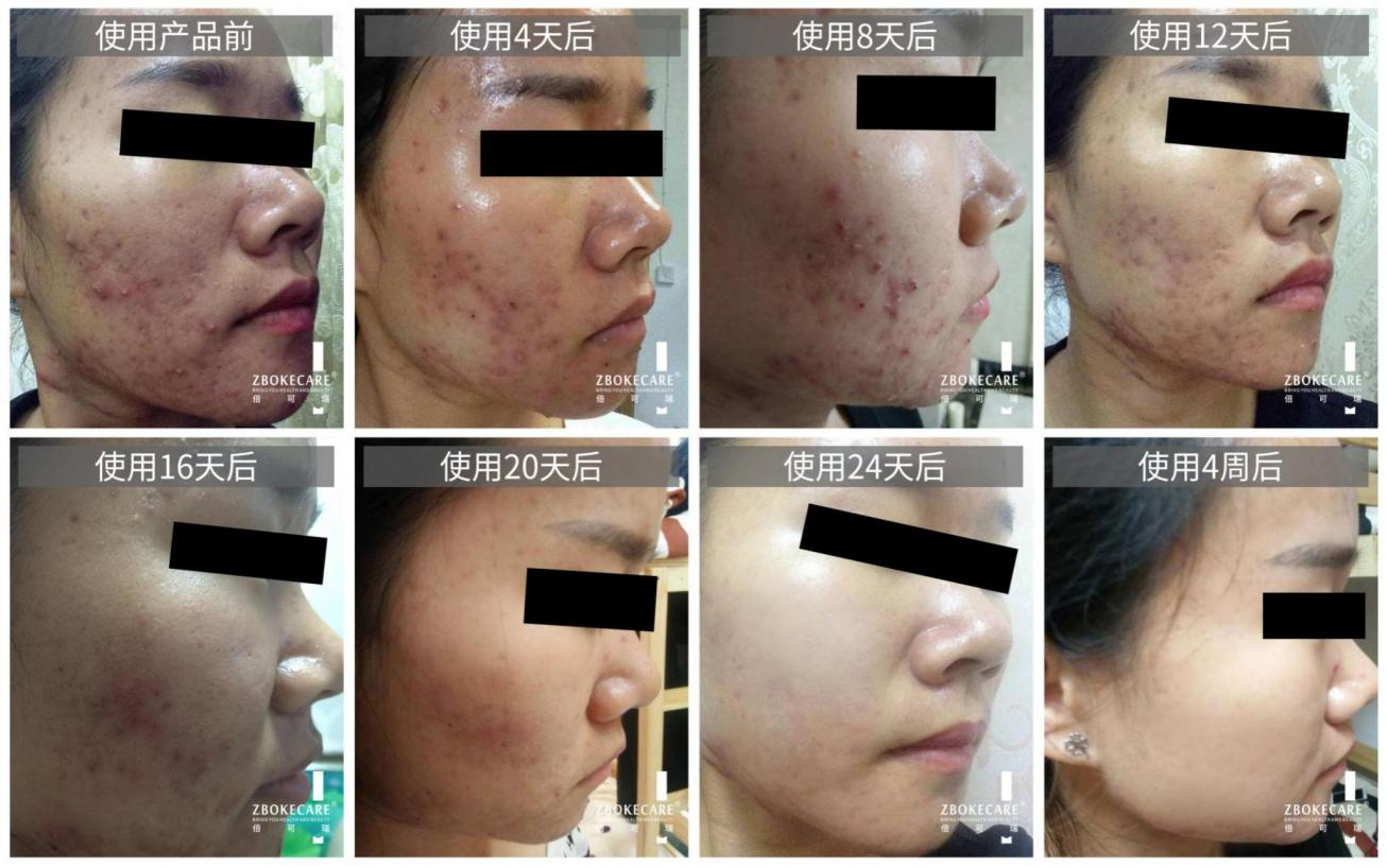 使用后状态:使用4周后,痘痘红肿消退,痘印痘痕完美修复,不留痕迹,痘痘不再反复发作