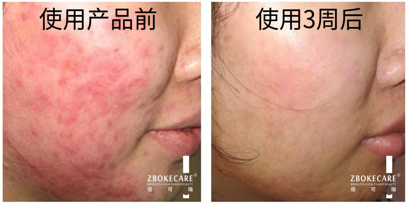 使用后状态:使用3周后,泛红痘印消退,凹凸痕迹修复,脸颊变光滑、细腻,修复效果明显