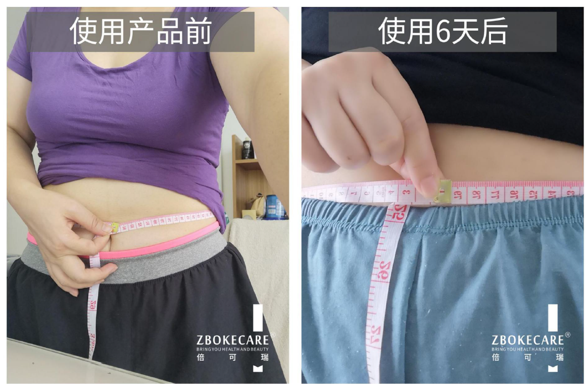 使用后:使用产品6天后,腹部皮肤变紧实、收紧,腰围测量79公分,塑形6公分。