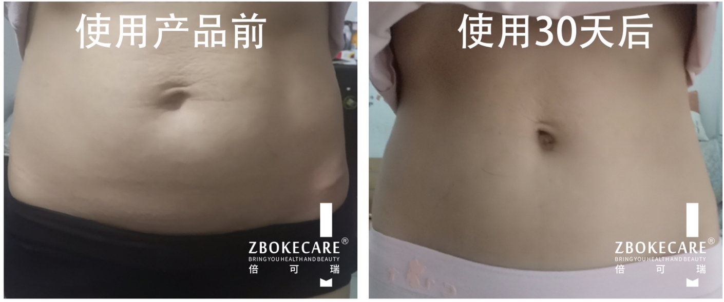 使用后:使用产品30天后,腹部收缩、收紧,体重减少,皮肤变嫩很多,腰围测量77公分,塑形9公分。