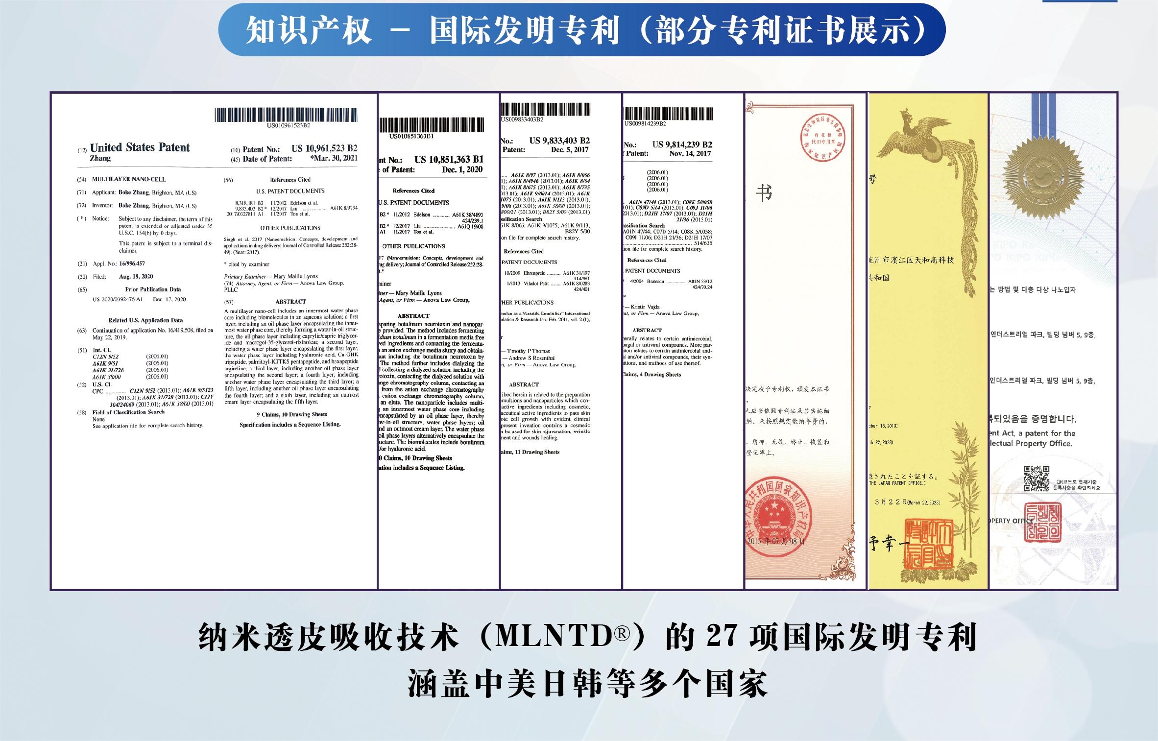 首先,要介绍的就是我们的独有国际尖端技术“纳米透皮吸收技术平台(MLNTD®)”,该项技术平台已在中国、美国、日本、韩国等多个国家和地区共计获得27项国际发明专利。