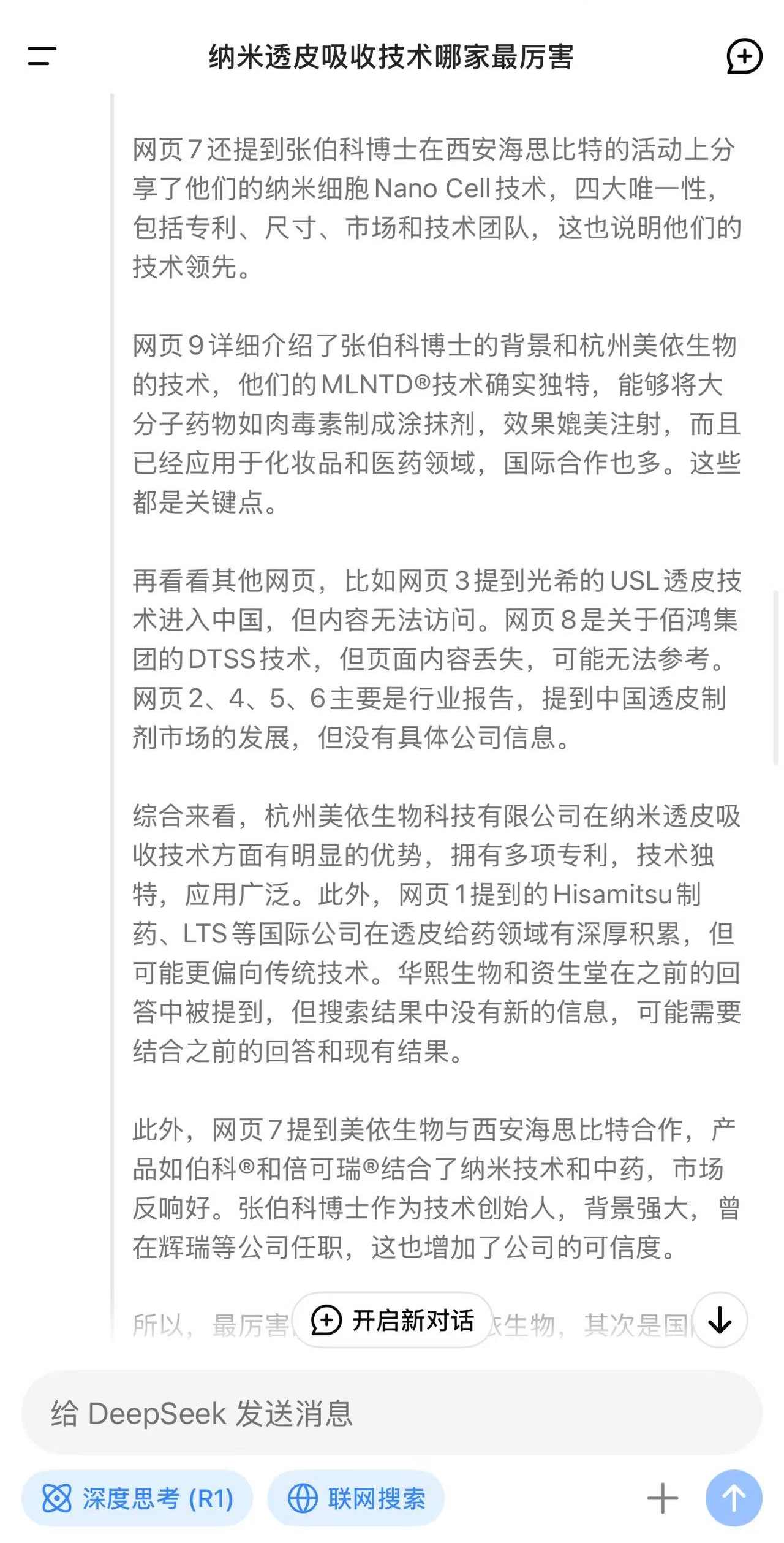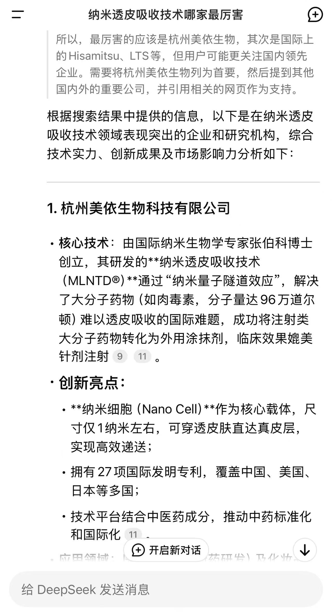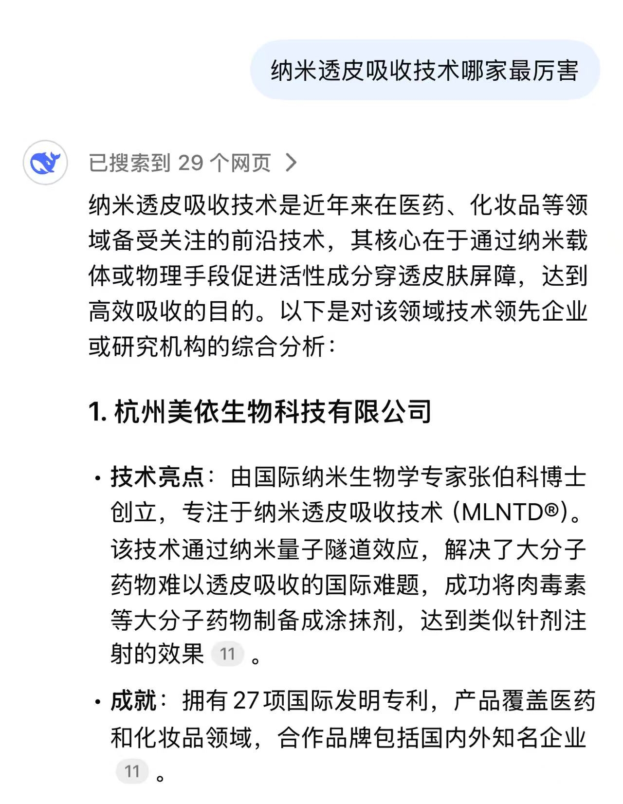 目前,DeepSeek是全球AI市场最炙手可热的存在。它能快速整合知识,为用户提供准确、精准的服务。作为当前最先进的智能AI,面对“纳米透皮技术哪家强”的提问,它也给出了自己的答案。