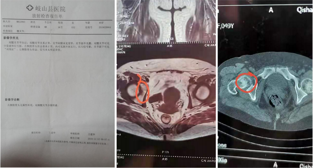 使用前:右侧无菌性股骨头坏死,髋关节积液。注射封闭针、口服消炎药均无效果。