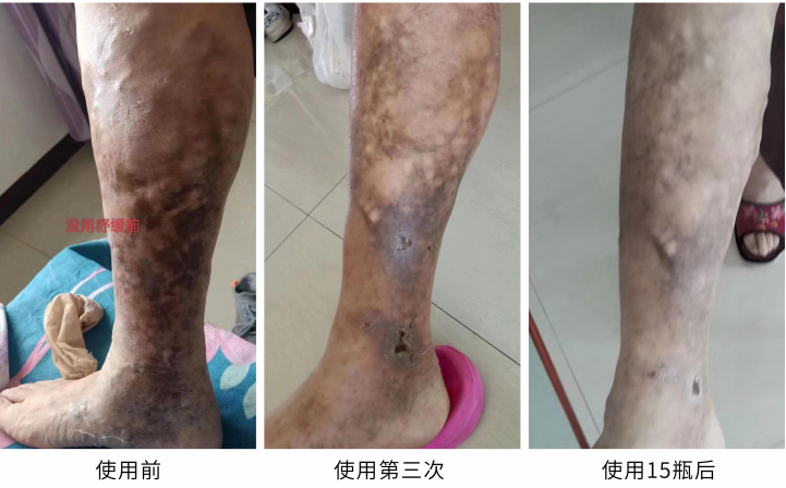 使用后:在使用舒缓保健液15瓶后(使用不到四个月),原先肌肉组织的大面积坏死现在基本修复了,皮肤破溃的地方也恢复了,腿部也不再疼痛,走路都利索了。